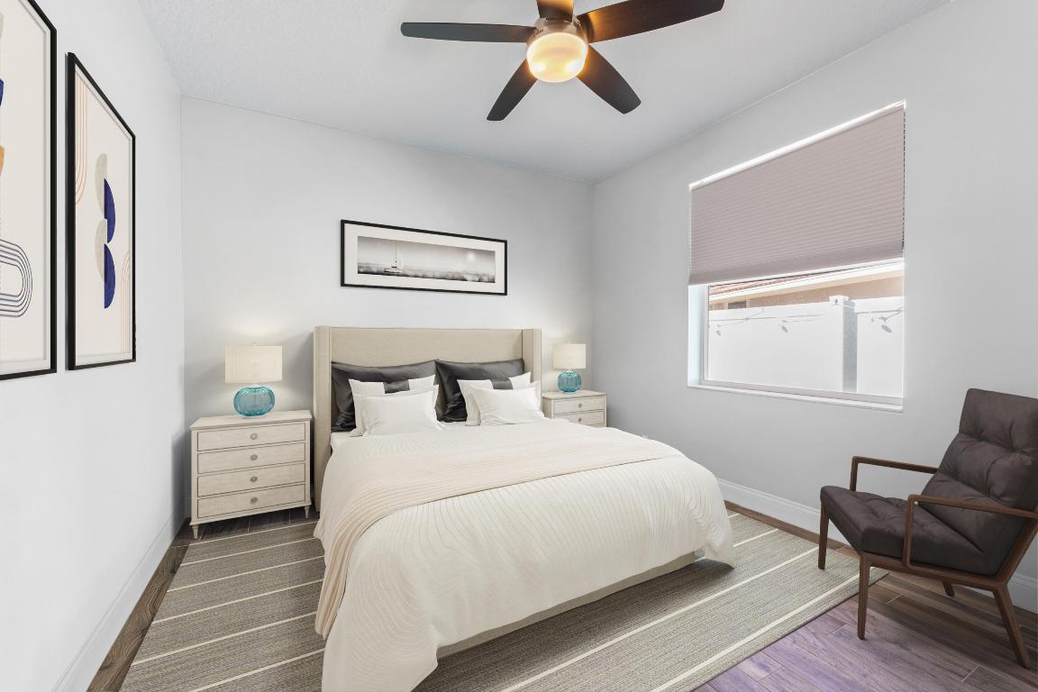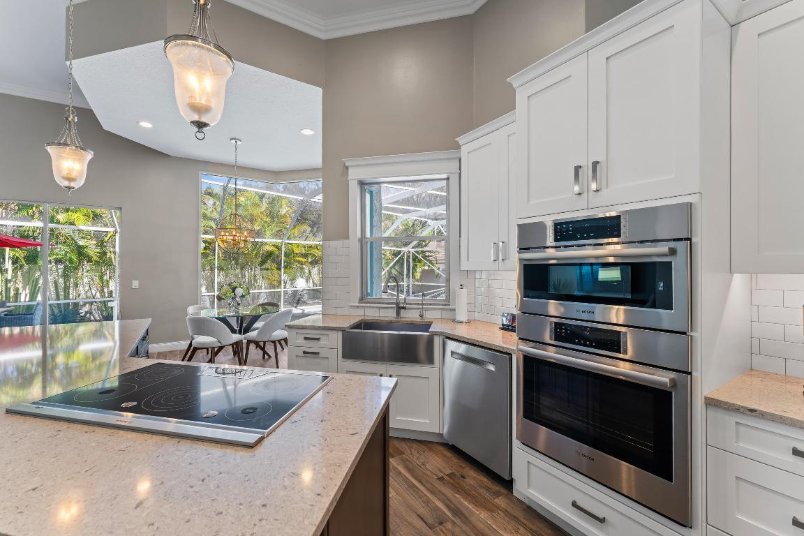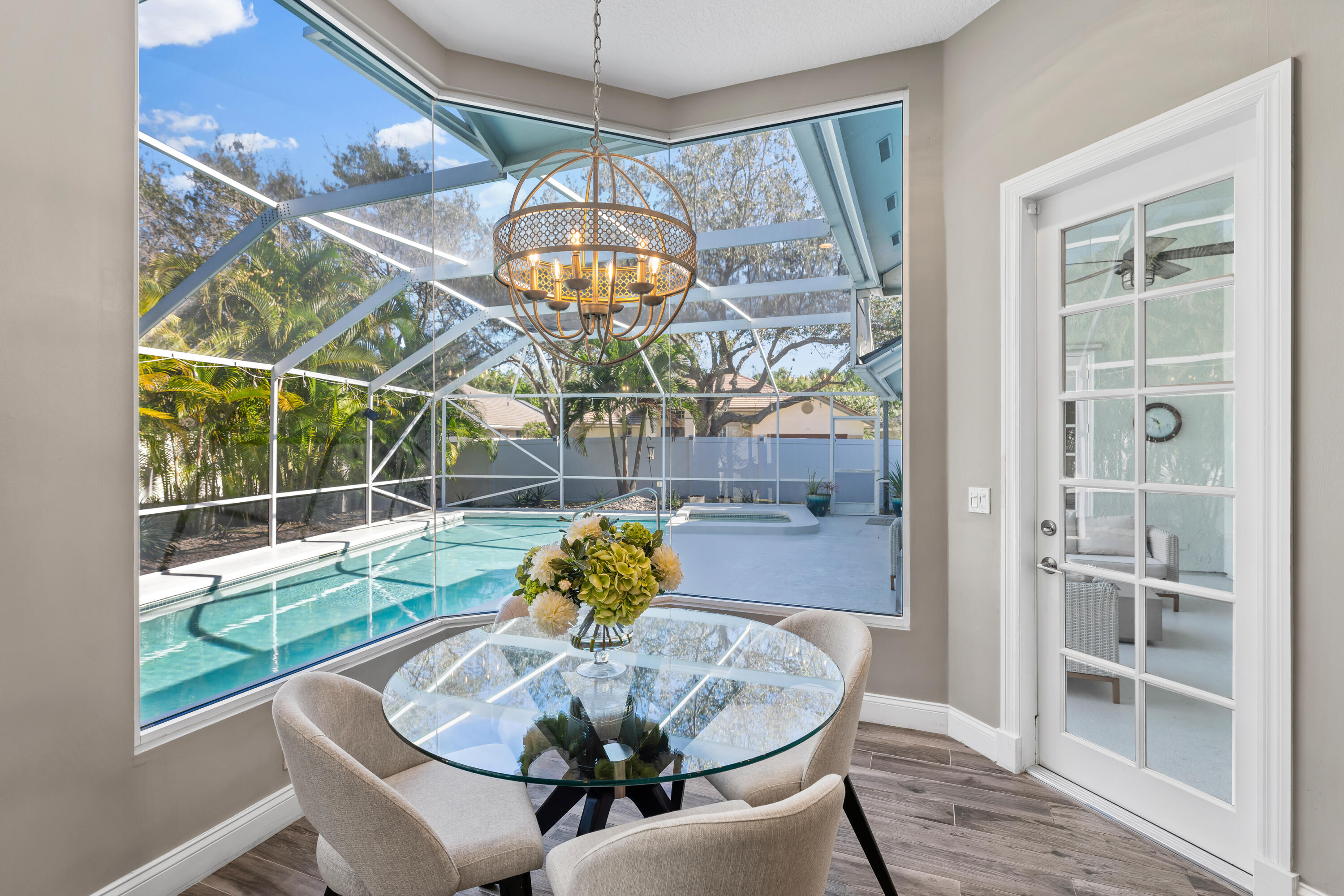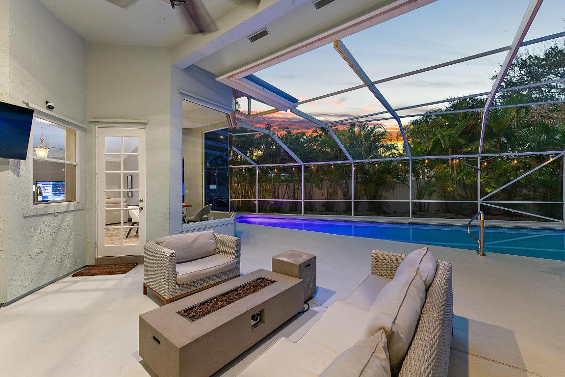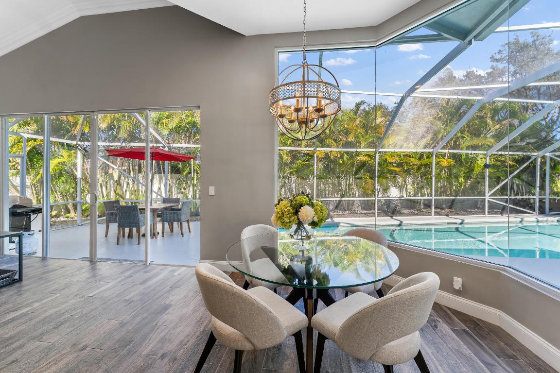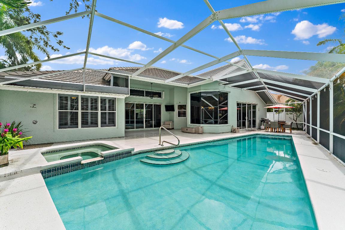 Welcome to this stunning 3-bedroom+den, 2.5-bathroom single-family home located in the exclusive gated community of The Preserve in Jupiter. This beautifully updated residence is situated on a large corner lot, fully fenced for privacy and outdoor enjoyment. Step inside to find modern elegance with porcelain wood-look flooring throughout, and a spacious layout that includes a den perfect for a home office or additional living space. The open-concept living area is ideal for entertaining, with a sleek wet bar and a chef's kitchen featuring white shaker cabinets, a contrasting brown shaker island, and high-end finishes. The kitchen seamlessly flows into the family room, creating a perfect gathering space. Outdoor living is a dream with a covered patio and screened enclosure surrounding the sparkling pool and spa, offering both comfort and style. Whether you're lounging by the pool or hosting guests, this home provides the perfect setting.