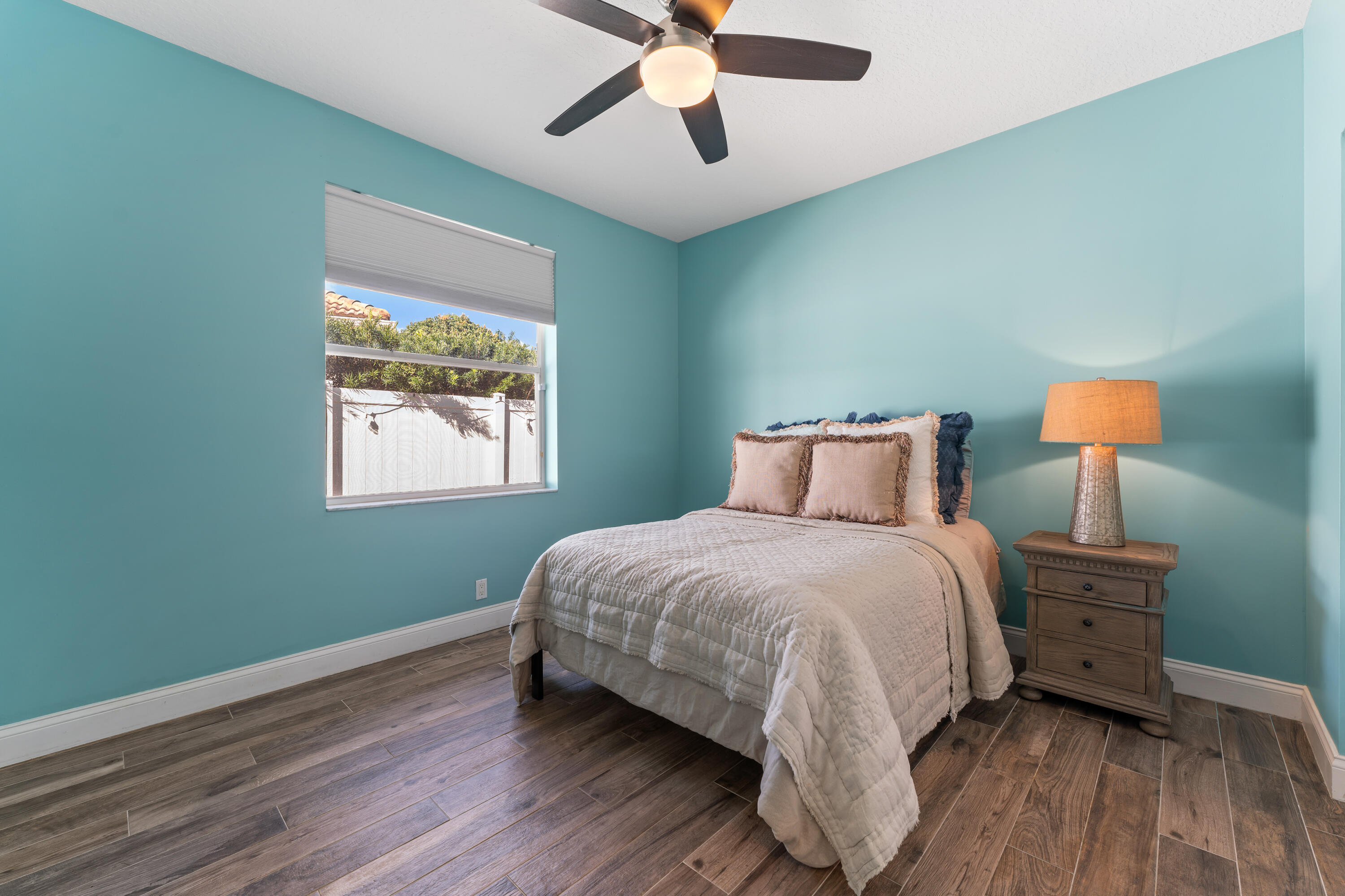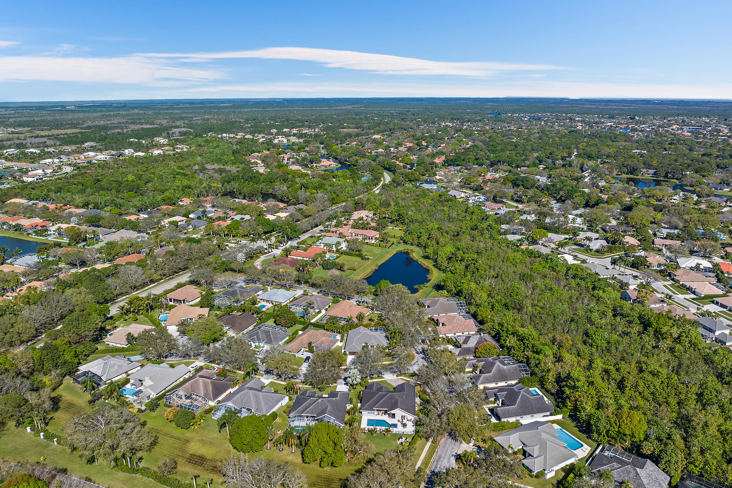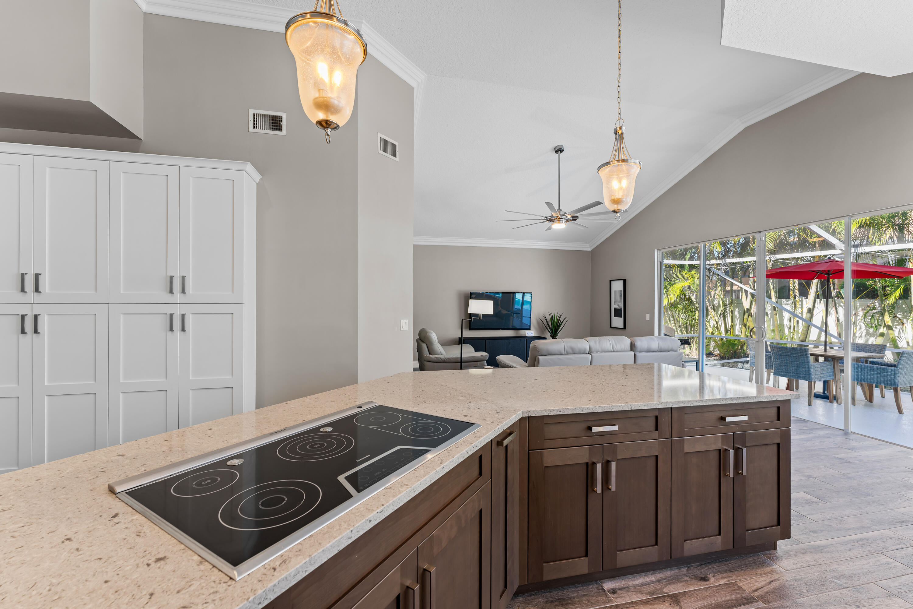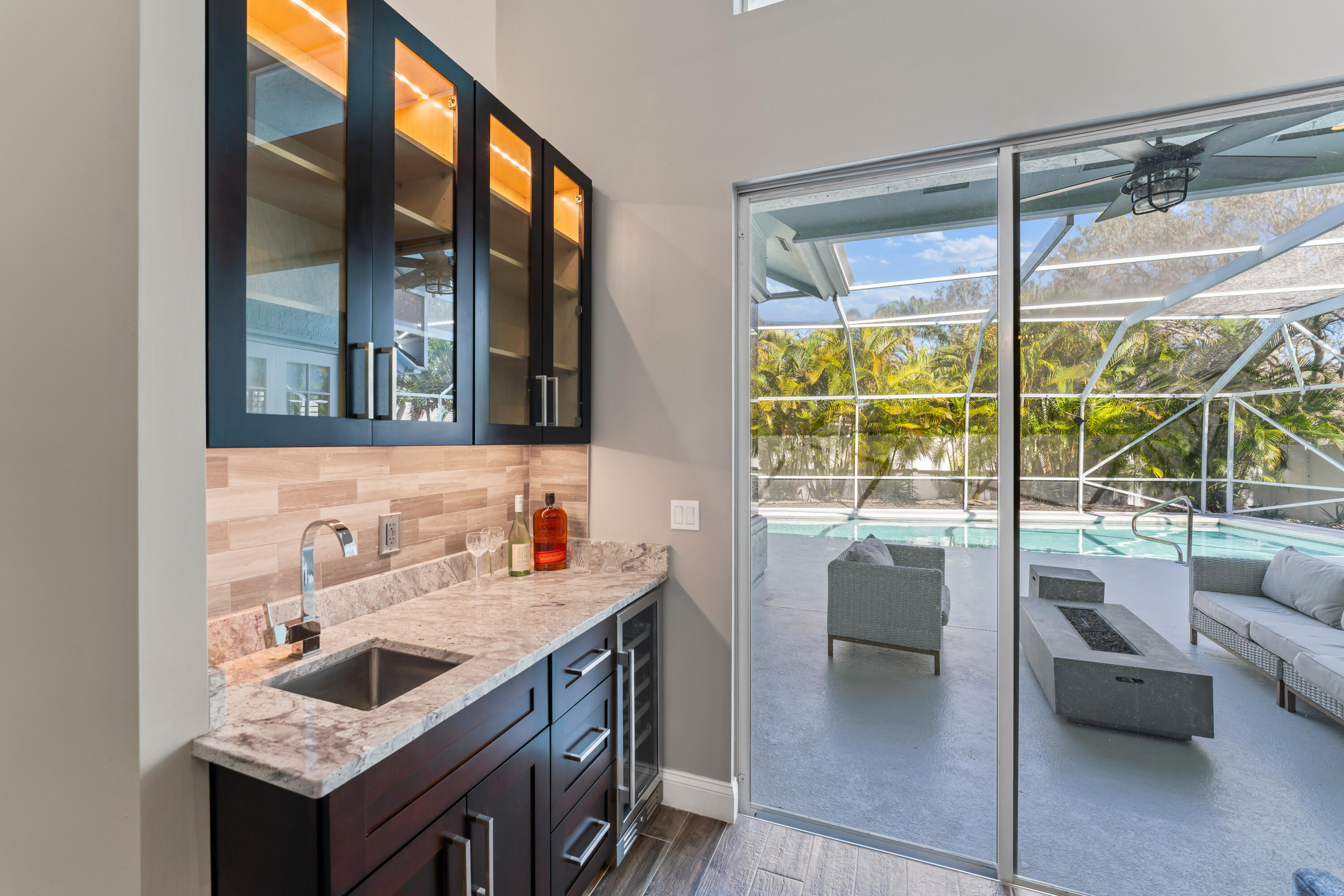 Welcome to this stunning 3-bedroom+den, 2.5-bathroom single-family home located in the exclusive gated community of The Preserve in Jupiter. This beautifully updated residence is situated on a large corner lot, fully fenced for privacy and outdoor enjoyment. Step inside to find modern elegance with porcelain wood-look flooring throughout, and a spacious layout that includes a den perfect for a home office or additional living space. The open-concept living area is ideal for entertaining, with a sleek wet bar and a chef's kitchen featuring white shaker cabinets, a contrasting brown shaker island, and high-end finishes. The kitchen seamlessly flows into the family room, creating a perfect gathering space. Outdoor living is a dream with a covered patio and screened enclosure surrounding the sparkling pool and spa, offering both comfort and style. Whether you're lounging by the pool or hosting guests, this home provides the perfect setting.
