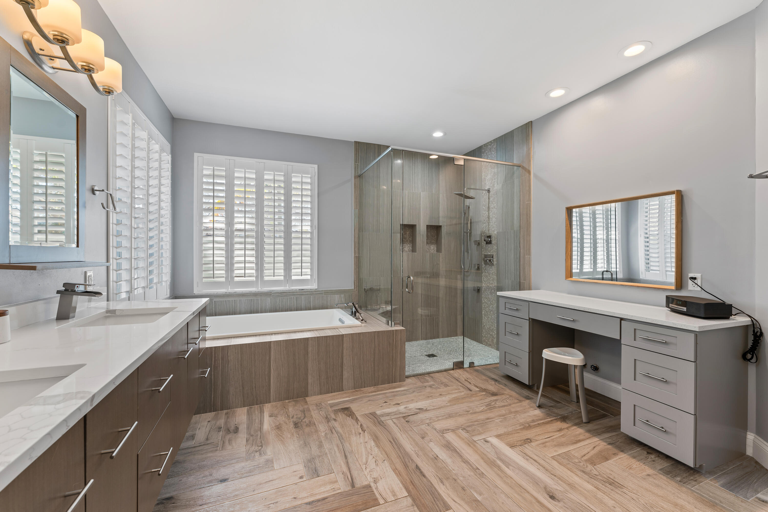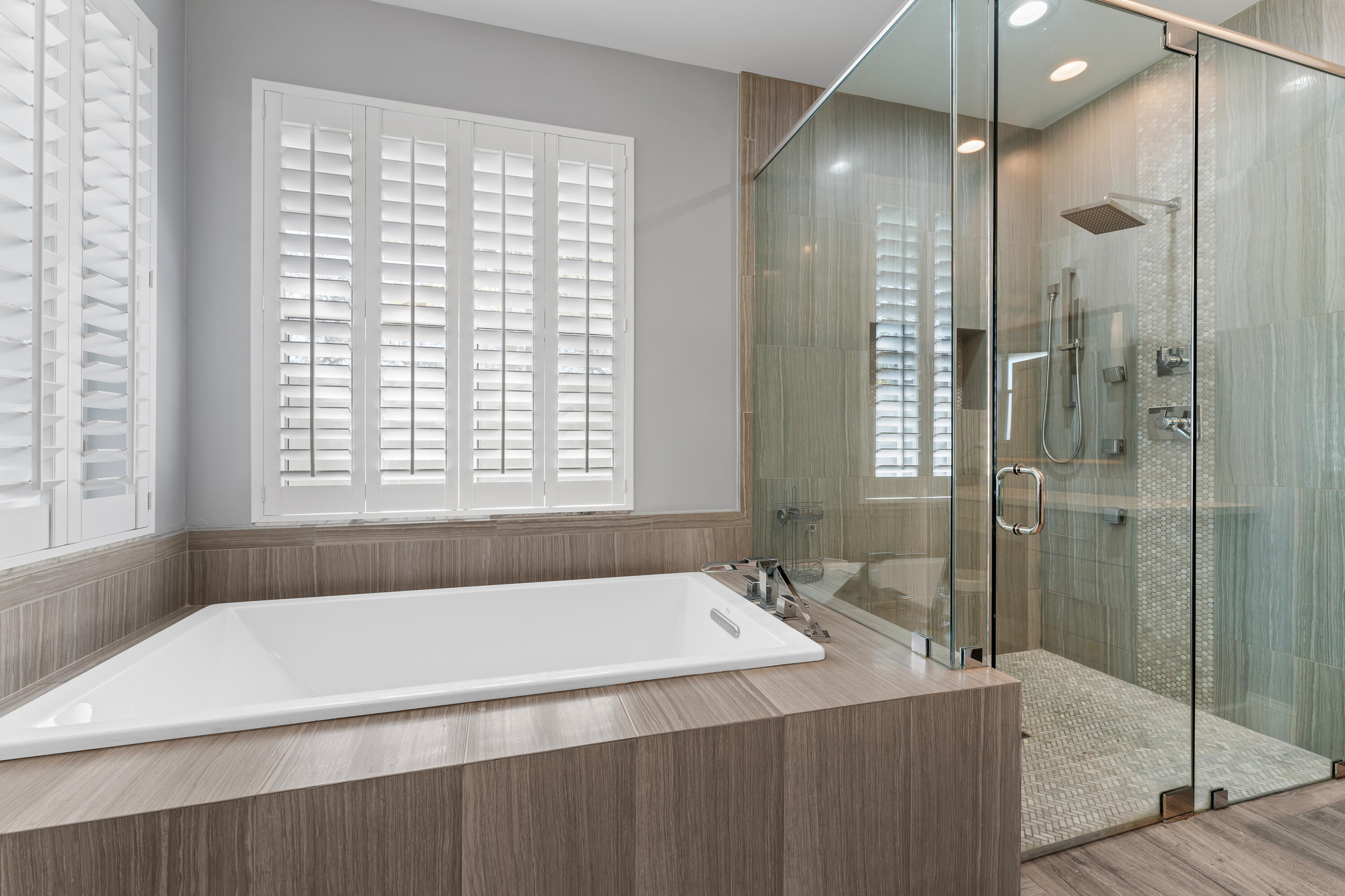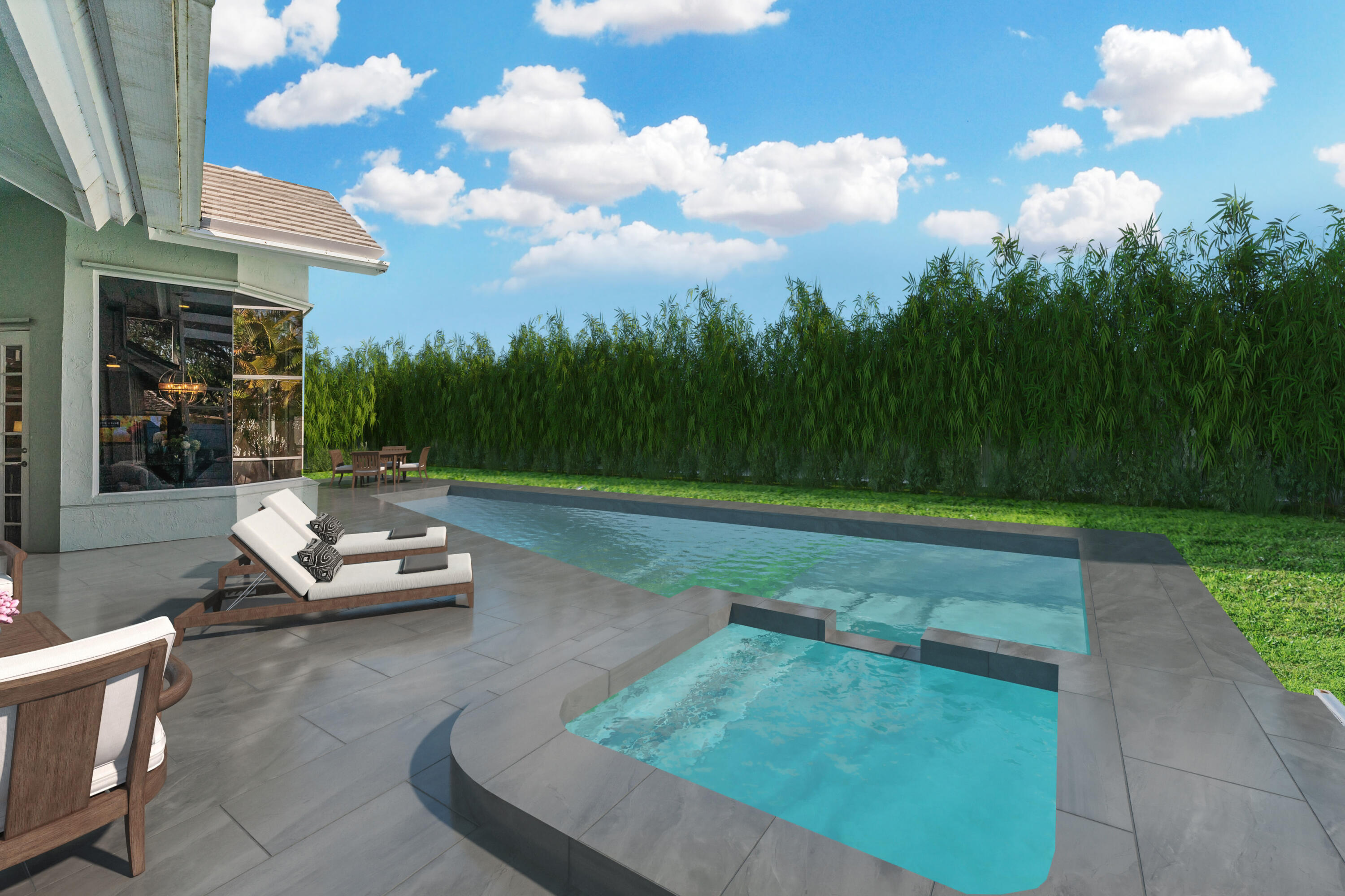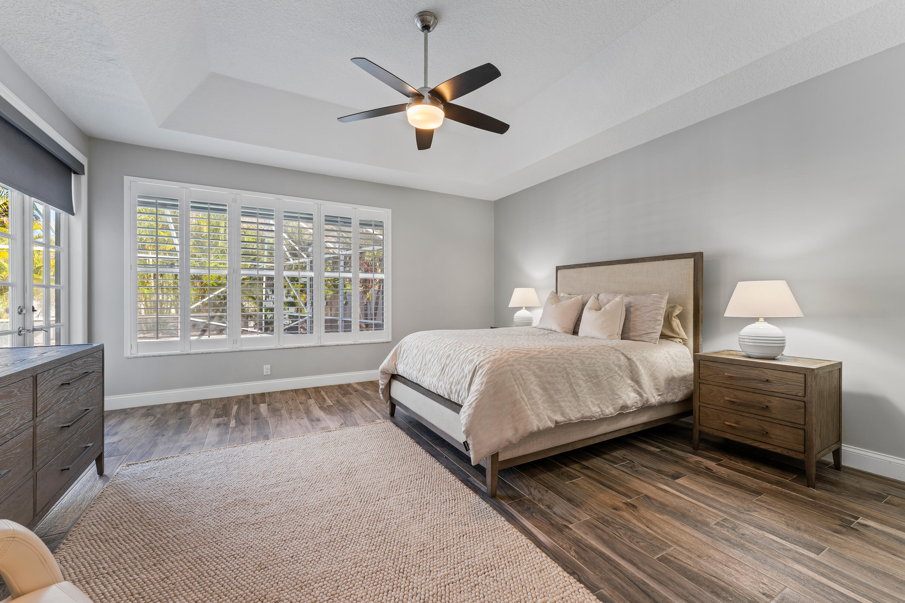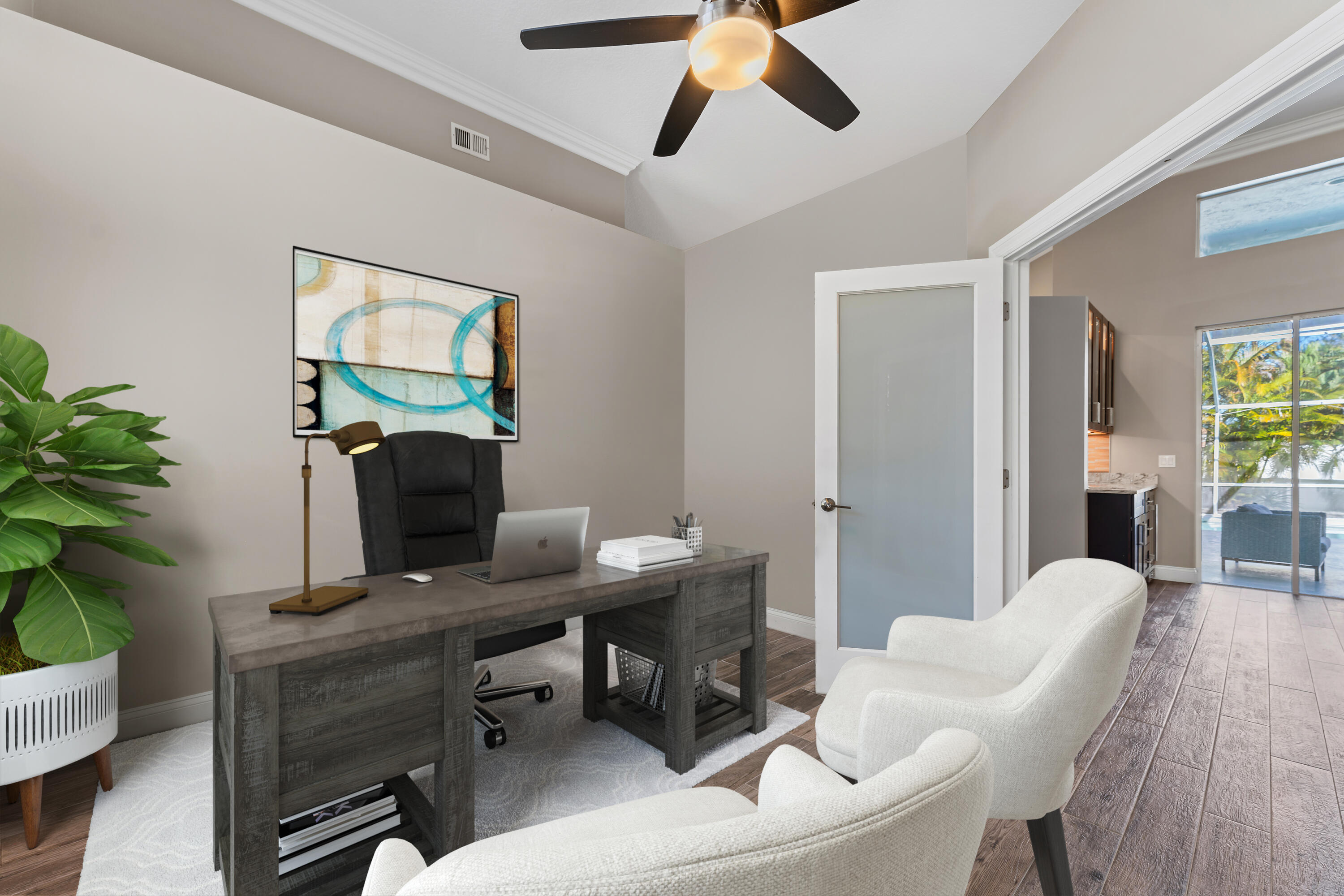 Welcome to this stunning 3-bedroom+den, 2.5-bathroom single-family home located in the exclusive gated community of The Preserve in Jupiter. This beautifully updated residence is situated on a large corner lot, fully fenced for privacy and outdoor enjoyment. Step inside to find modern elegance with porcelain wood-look flooring throughout, and a spacious layout that includes a den perfect for a home office or additional living space. The open-concept living area is ideal for entertaining, with a sleek wet bar and a chef's kitchen featuring white shaker cabinets, a contrasting brown shaker island, and high-end finishes. The kitchen seamlessly flows into the family room, creating a perfect gathering space. Outdoor living is a dream with a covered patio and screened enclosure surrounding the sparkling pool and spa, offering both comfort and style. Whether you're lounging by the pool or hosting guests, this home provides the perfect setting.