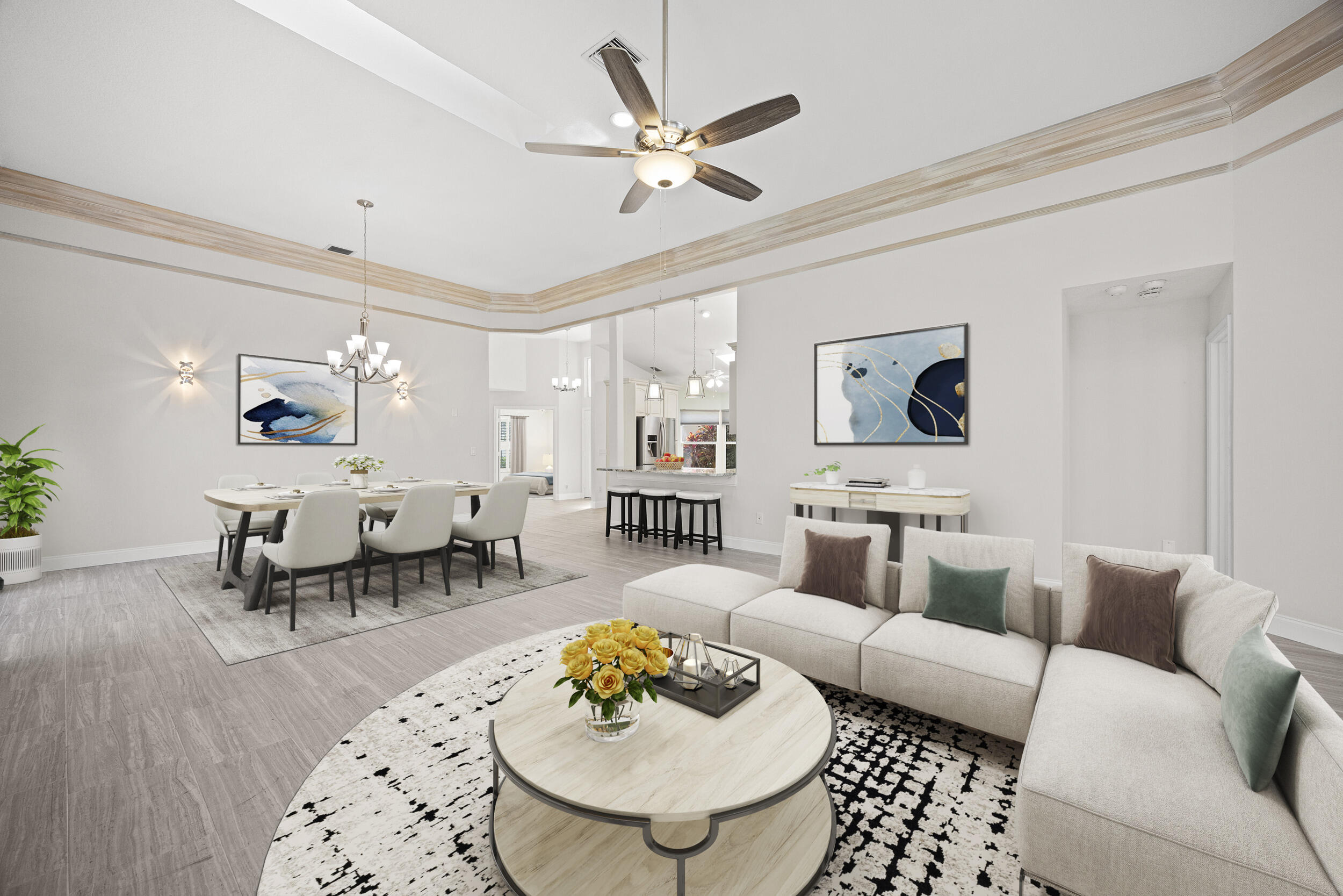 Natural light fills the home through its desirable northwest exposure, accentuating soaring ceilings, custom crown molding, and a striking stacked-stone fireplace with a built-in media wall that creates a warm and inviting focal point. READ MORE... The open-concept kitchen features granite countertops, stainless steel appliances, and seamless flow into the living and dining areas, making the home perfect for both everyday living and entertaining.