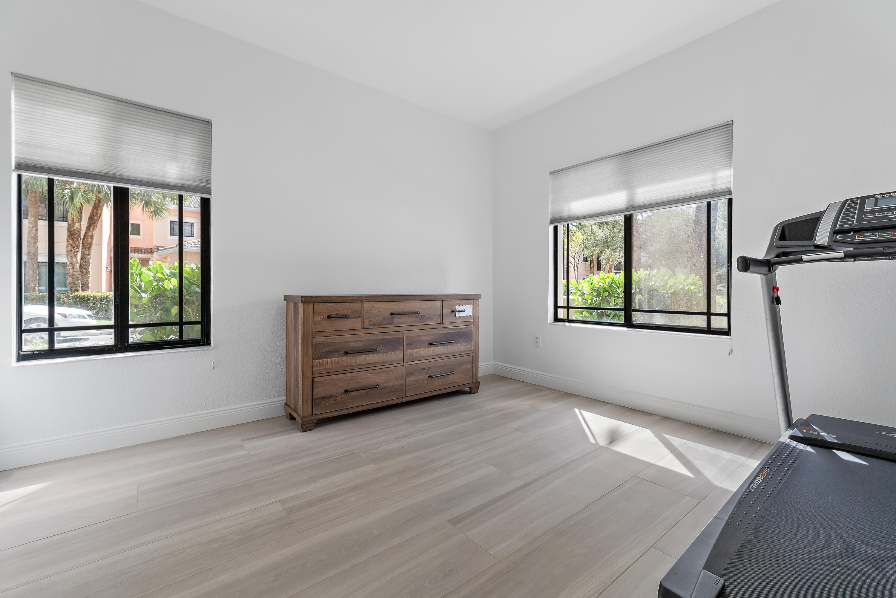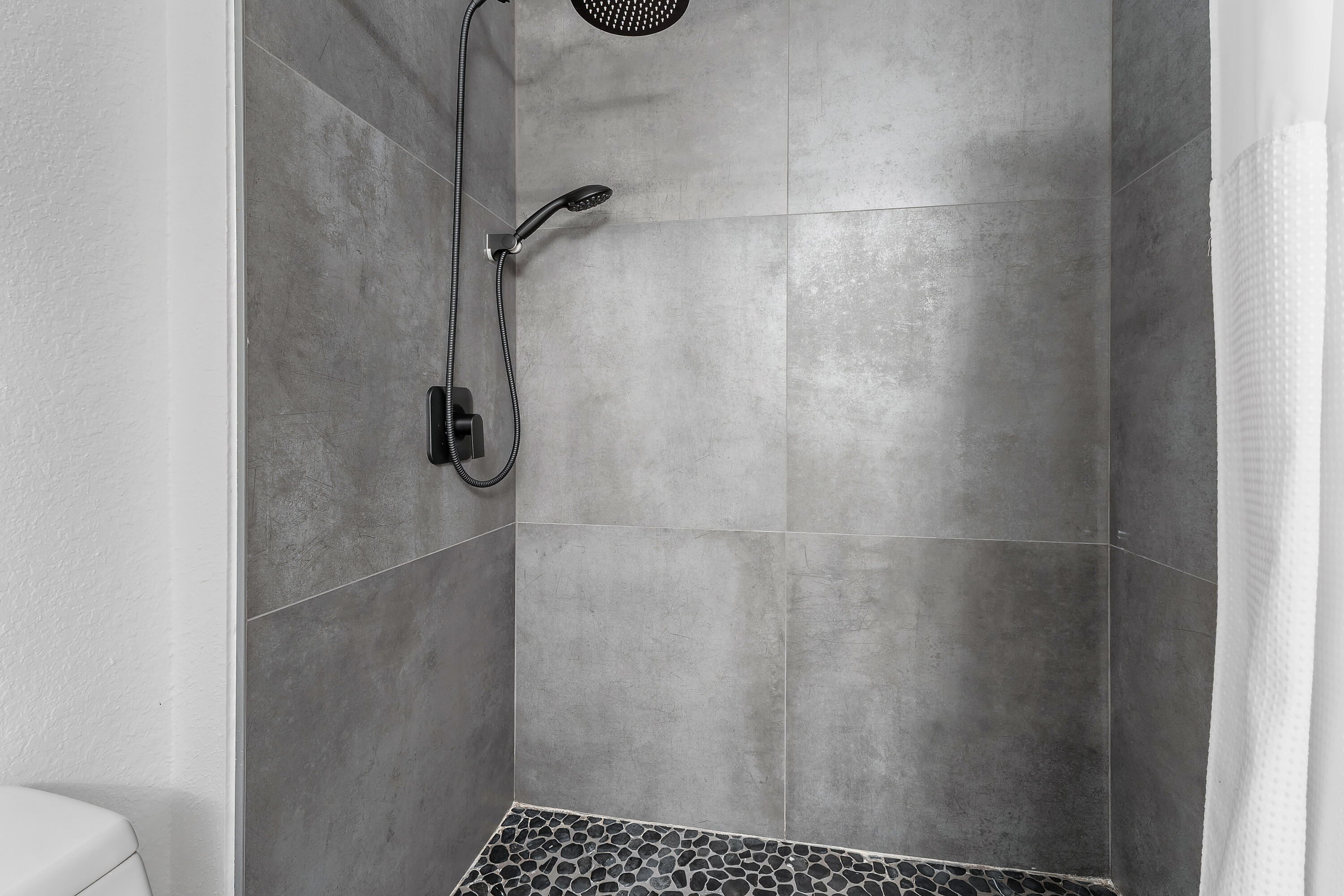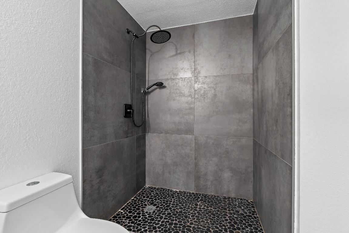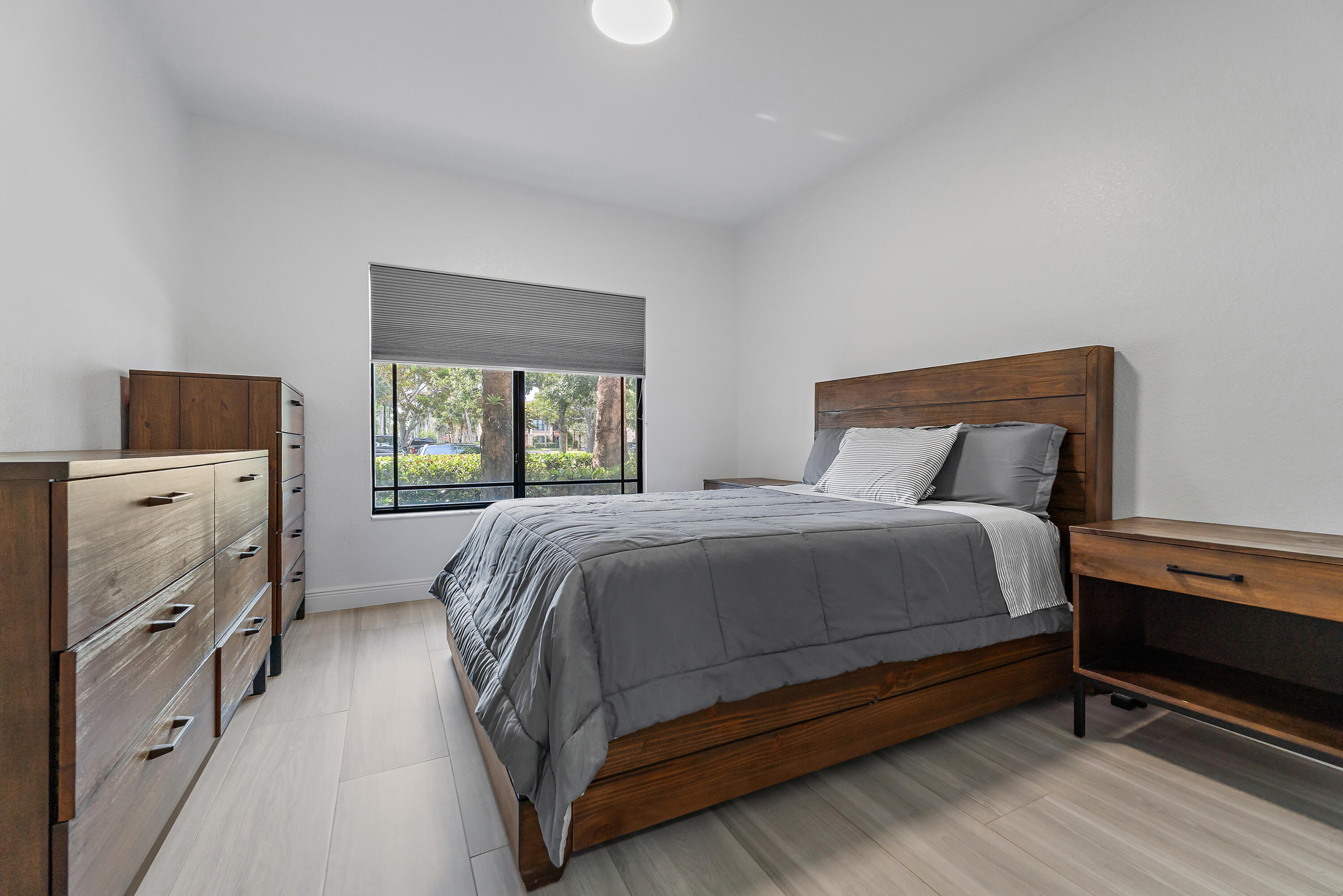 Experience a true top-to-bottom renovation in this beautifully redesigned first-floor 2-bedroom, 2-bath condo in San Matera -- where every finish, fixture, and feature has been thoughtfully selected for modern living. From brand-new interior doors with upgraded hinges and hardware to the open interior layout, this home offers a level of craftsmanship and attention to detail that sets it apart. The sleek, open kitchen showcases white shaker cabinetry, quartz countertops, stainless steel appliances, and a brand-new stove, creating both an elegant focal point and a highly functional space for everyday cooking or entertaining. Wide-plank gray wood-look tile carries throughout the home, enhancing flow and continuity while adding a clean, contemporary look. Both bathrooms have been luxuriously updated with white shaker vanities, matte black hardware, and stunning walk-in showers finished with charcoal large-format tile and pebblestone shower floors for a spa-inspired feel. Even the smallest touches from lighting to handles to hinges reflect the home's complete modernization.