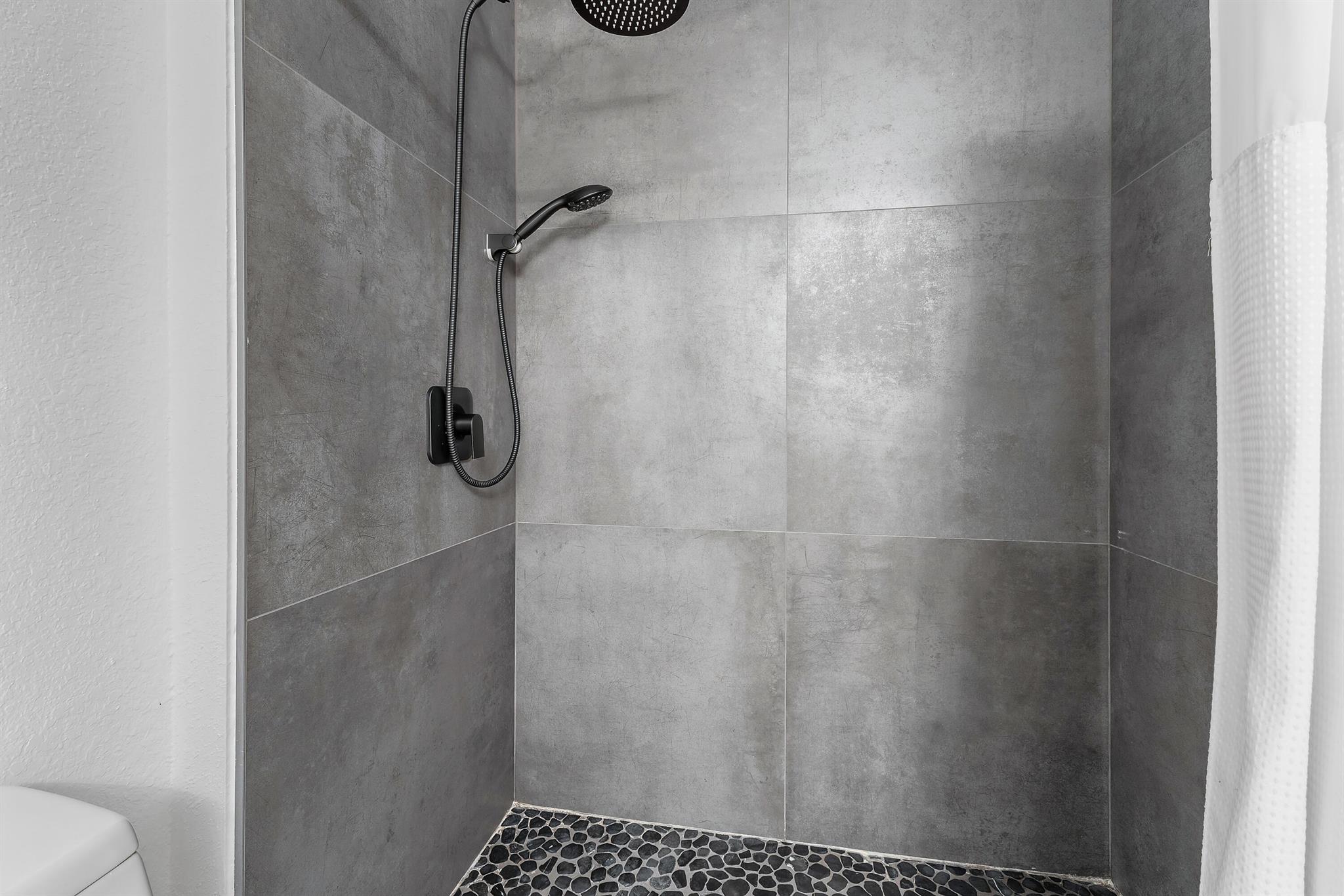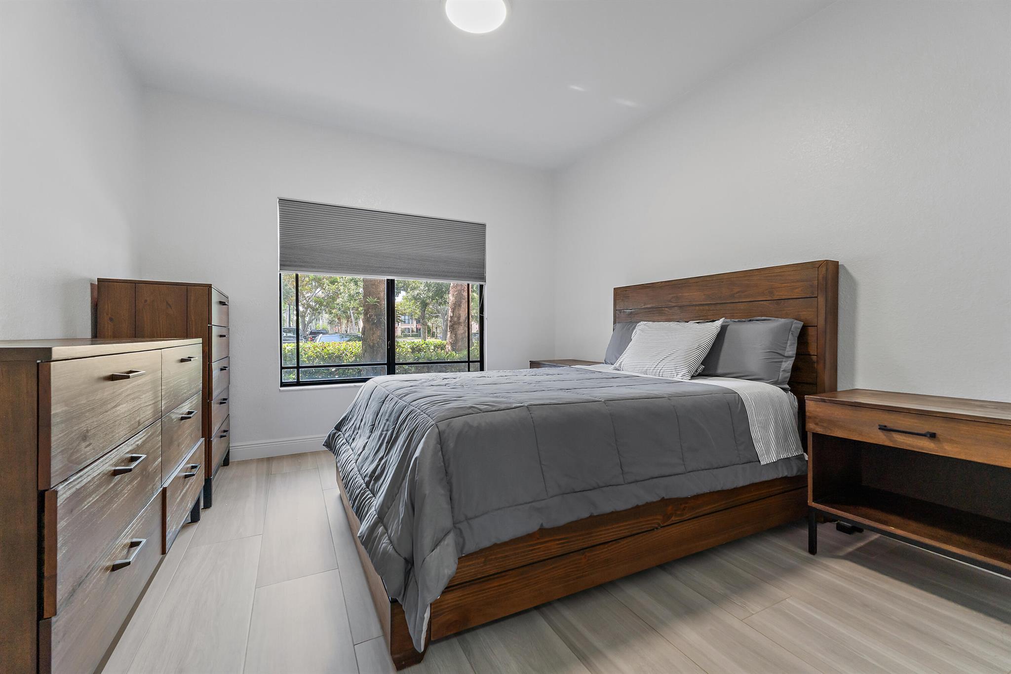 This fully renovated first-floor two-bedroom, two-bath condo in San Matera offers a modern, turnkey lifestyle in a gated, pet-friendly community. The wide-open kitchen has been completely reinvented with white shaker cabinetry, quartz countertops, stainless steel appliances, and a brand-new stove. Wide plank, gray wood-look tile flooring flows seamlessly throughout, giving the home a clean and contemporary aesthetic. Both bathrooms complement the home's updates with white shaker vanities, sleek black accents, and beautifully reimagined showers featuring charcoal large-format tile walls and pebblestone floors for a spa-inspired finish. Additional peace of mind comes with an HVAC system (2018) and water heater (2021), with the entire HVAC system--including