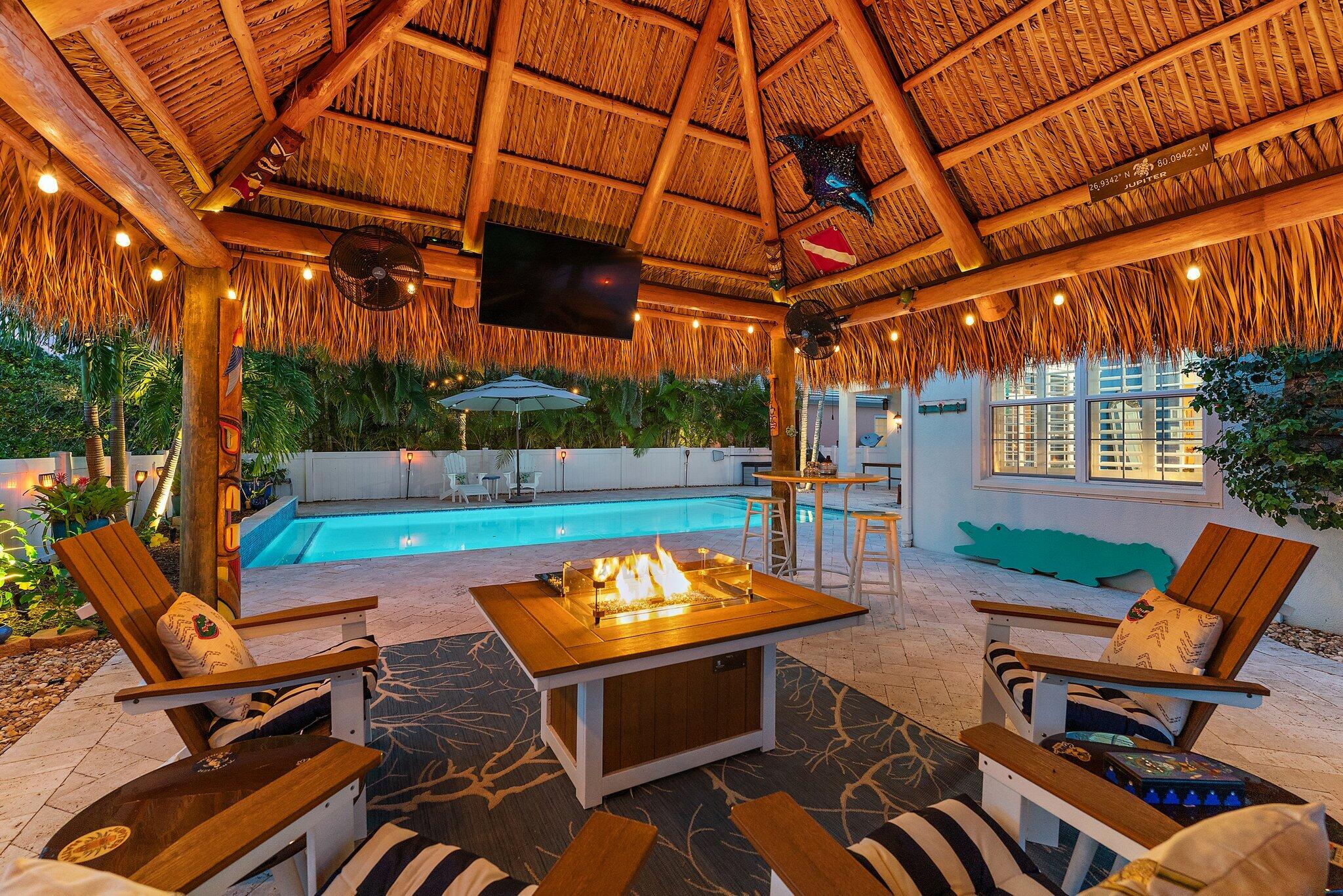 Welcome to this beautiful single story 3-bedroom, 2-bathroom home with a den, nestled in the highly sought-after Martinique community of Abacoa. If your lifestyle revolves around outdoor entertaining and relaxation, then this property is a true gem! The focal point of the backyard is an exquisite Travertine decked 30x15 saltwater pool. The expansive outdoor space also boasts an oversized tiki hut, perfectly blending the charm of tropical living with the comfort of modern amenities. Inside, the kitchen features white cabinetry and Corian countertops opening up to both the living and dining areas. Enjoy the added bonus of a private den/office/game room at the front of the house. Ceramic tile runs throughout the living areas complimented by wood plank flooring in the bedrooms and den. Fully fenced in backyard and located in the north end of the community on a spacious lot with great privacy.
