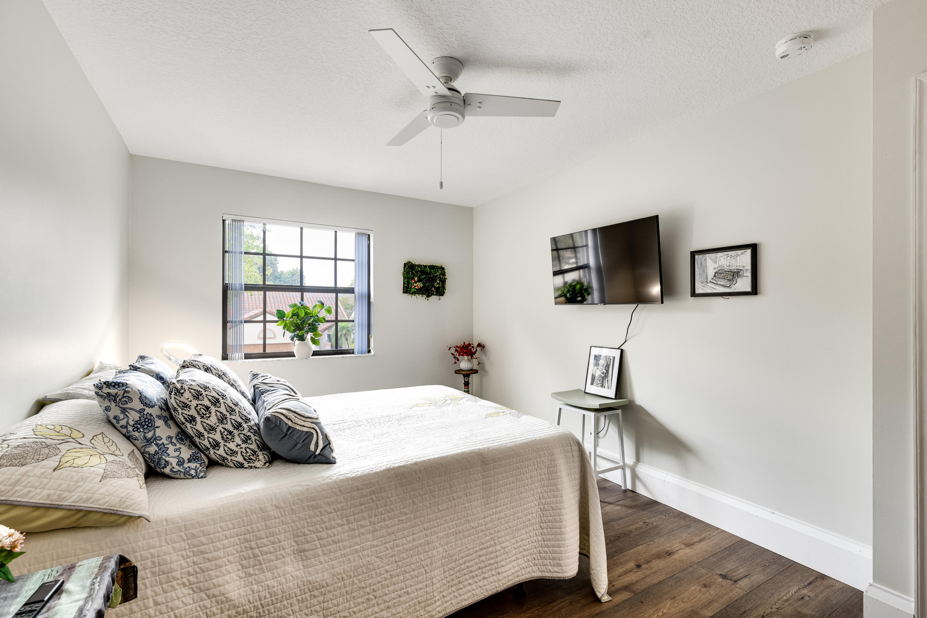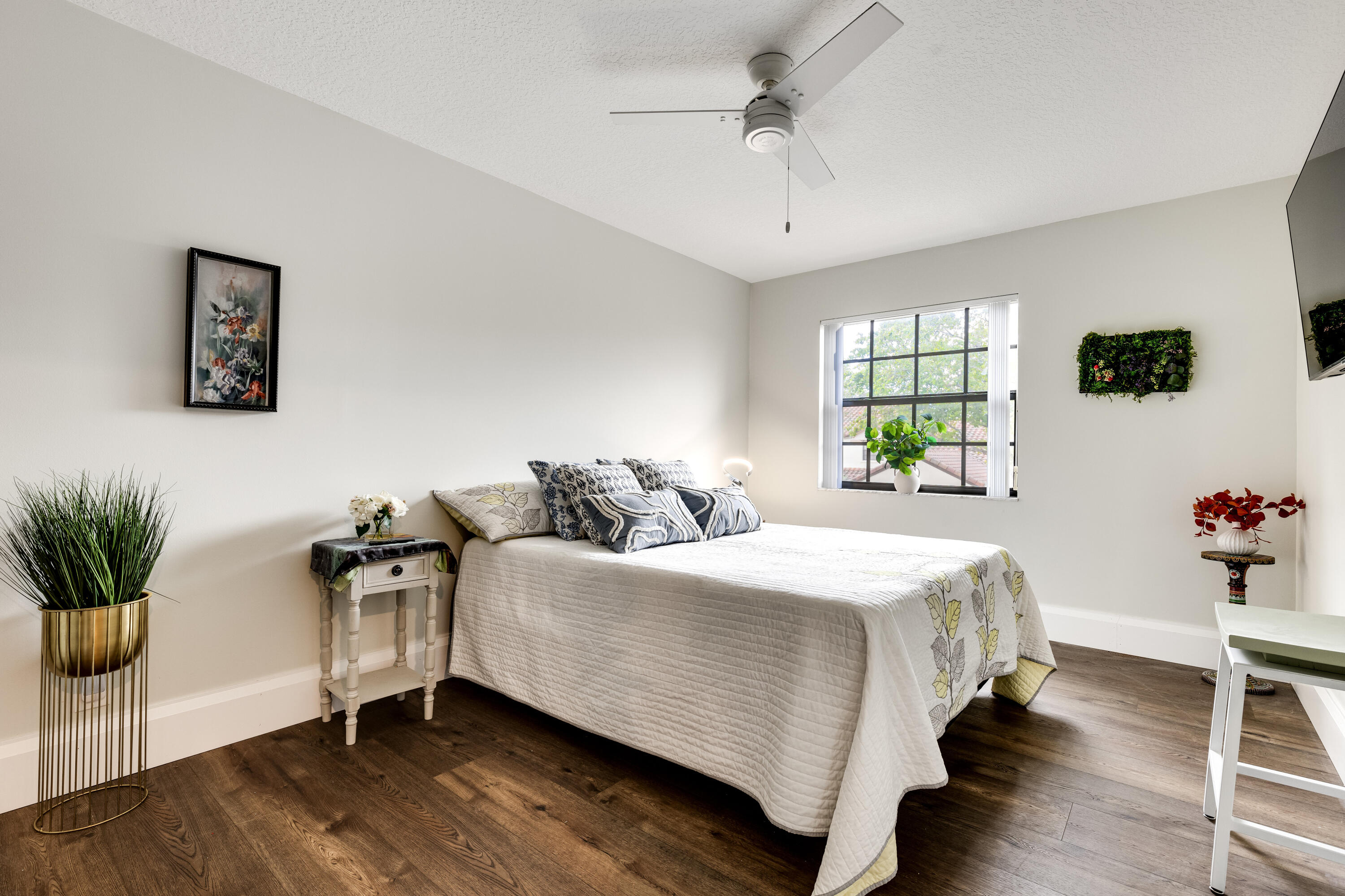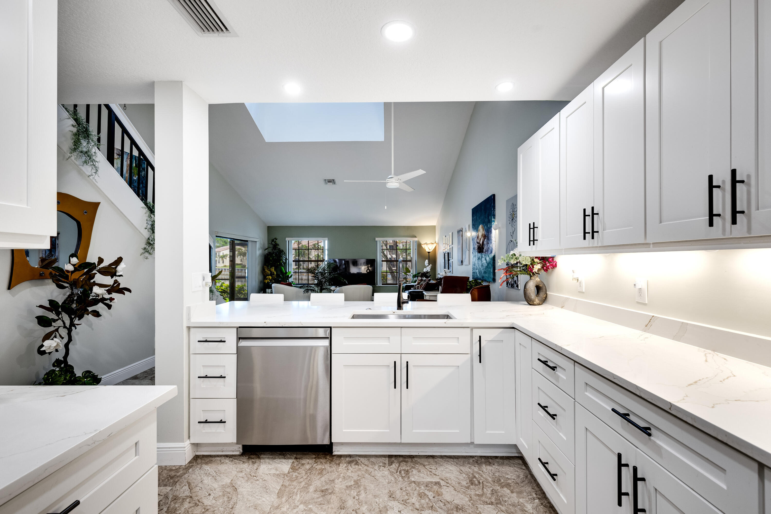 Welcome to this stunning lakefront villa, the largest model in the community, boasting 2,177 sq. ft. of living space. No stone has been left unturned in this fully renovated 3-bedroom, 2.5-bath home, where every detail has been meticulously updated by the owners, showcasing modern touches throughout. The gourmet kitchen features 42-inch white shaker cabinets, sleek quartz countertops, and seamlessly opens to the dining and living areas, perfect for entertaining. The bi-level dining area has been removed to create a spacious, streamlined, one-level living space. Adding to the home's appeal are impact glass windows throughout, a new HVAC system installed in 2024, and no popcorn ceilings, providing a modern and low-maintenance experience. Convenience meets luxury with the primary bedroom located on the first floor offering direct access to the screened-in patio where you can enjoy serene lake views. Upstairs, a generous landing leads to two additional bedrooms and a shared full bath, ideal for family or guests.