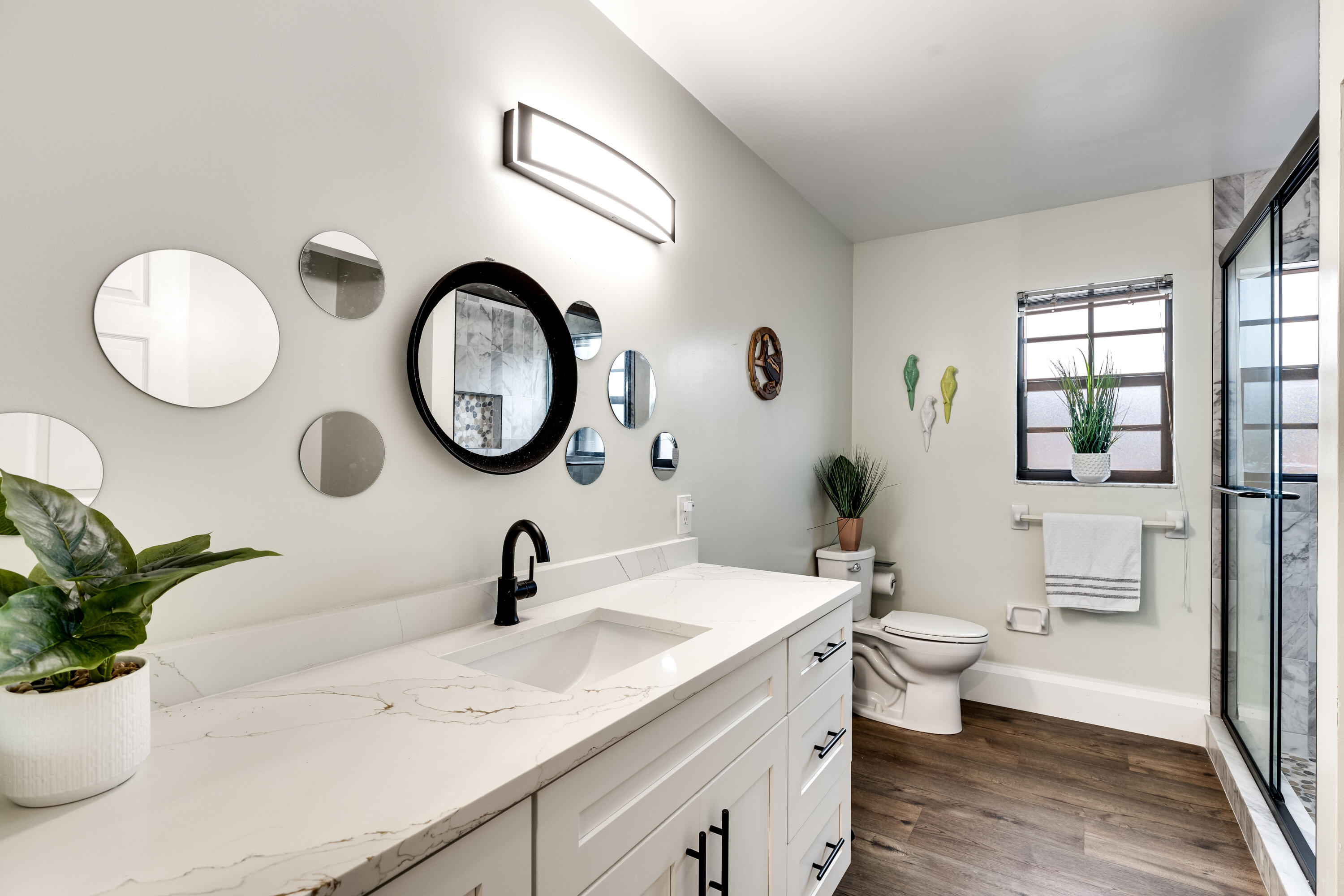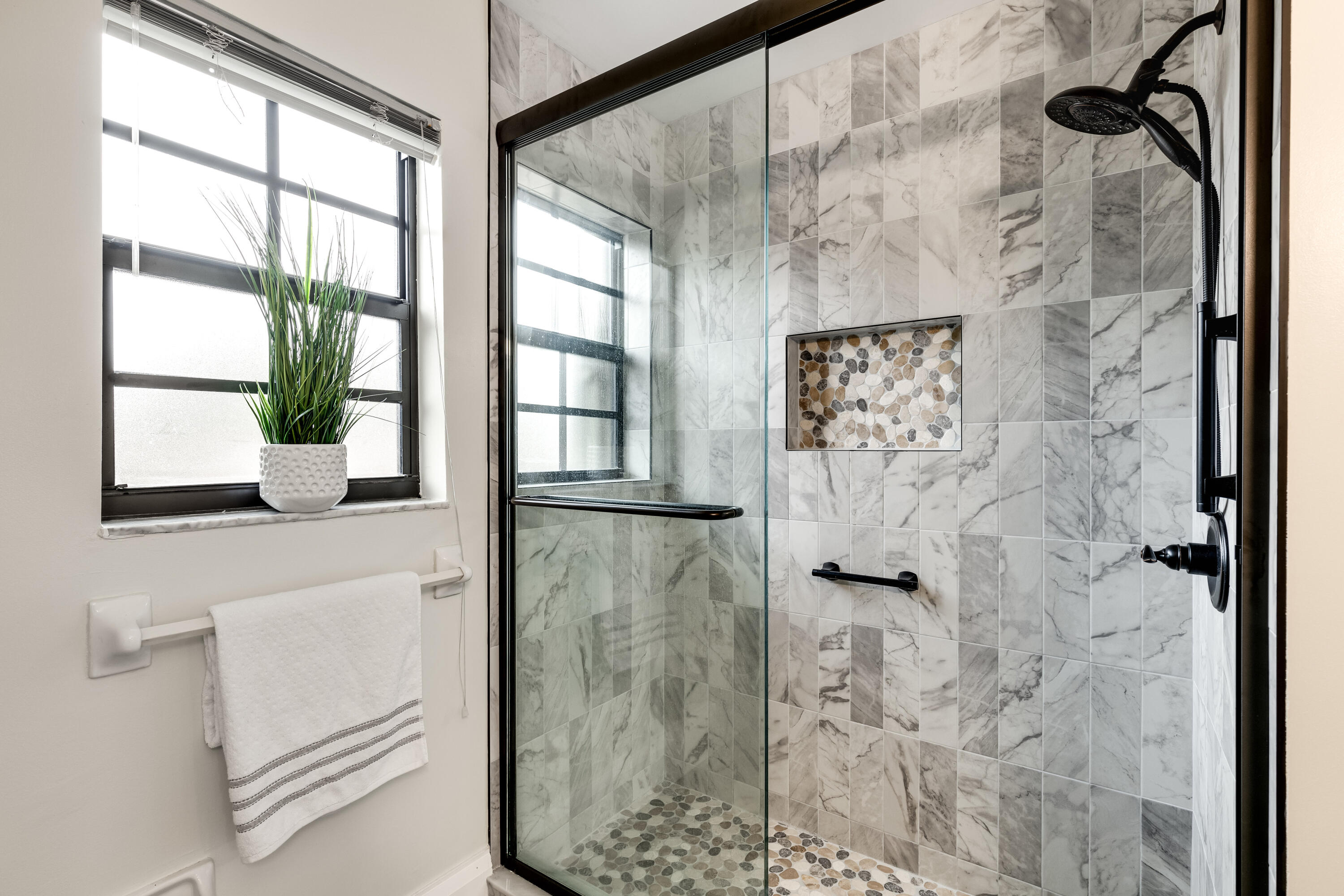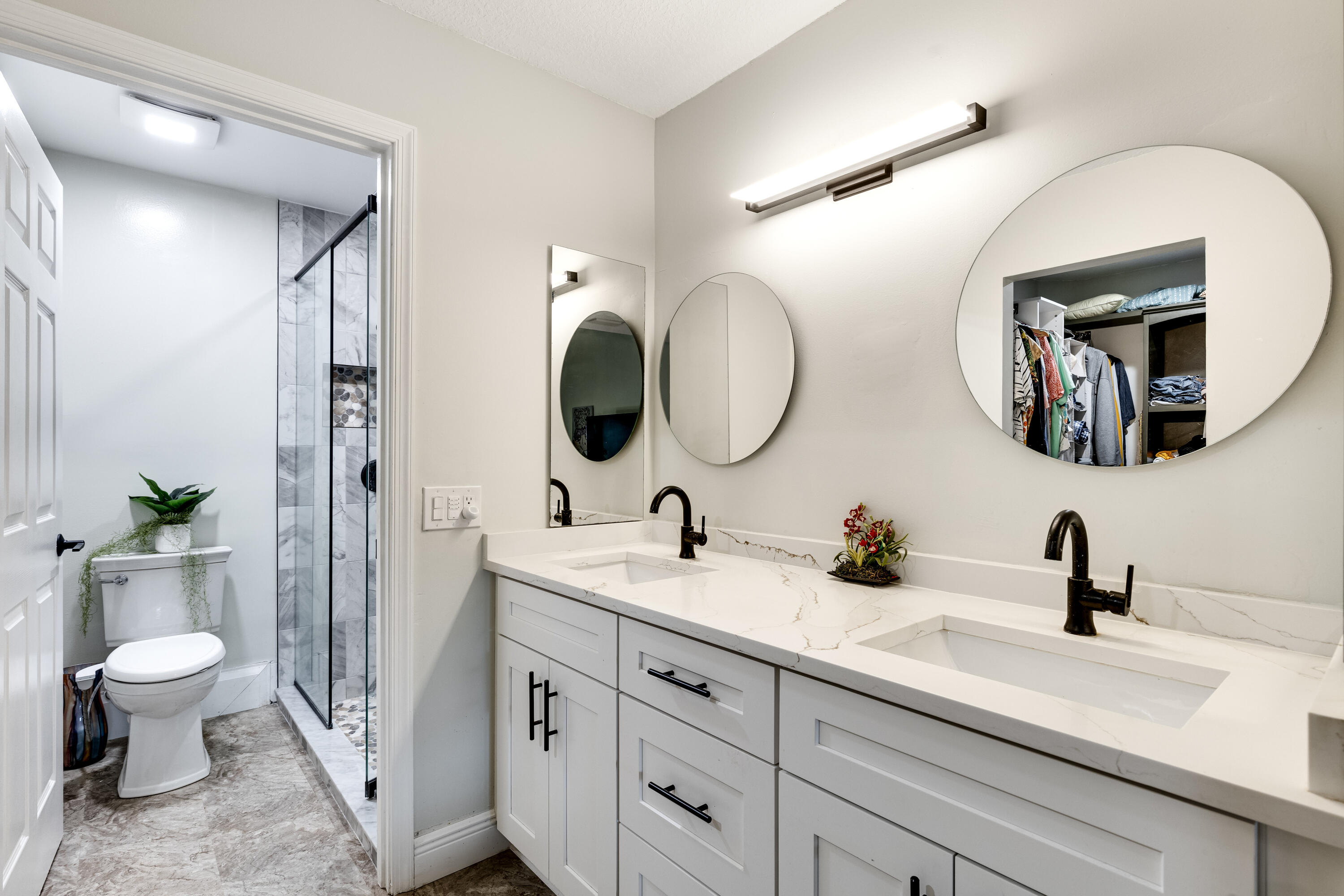 Welcome to this stunning lakefront villa, the largest model in the community, boasting 2,177 sq. ft. of living space. No stone has been left unturned in this fully renovated 3-bedroom, 2.5-bath home, where every detail has been meticulously updated by the owners, showcasing modern touches throughout. The gourmet kitchen features 42-inch white shaker cabinets, sleek quartz countertops, and seamlessly opens to the dining and living areas, perfect for entertaining. The bi-level dining area has been removed to create a spacious, streamlined, one-level living space. Adding to the home's appeal are impact glass windows throughout, a new HVAC system installed in 2024, and no popcorn ceilings, providing a modern and low-maintenance experience. Convenience meets luxury with the primary bedroom located on the first floor offering direct access to the screened-in patio where you can enjoy serene lake views. Upstairs, a generous landing leads to two additional bedrooms and a shared full bath, ideal for family or guests.
