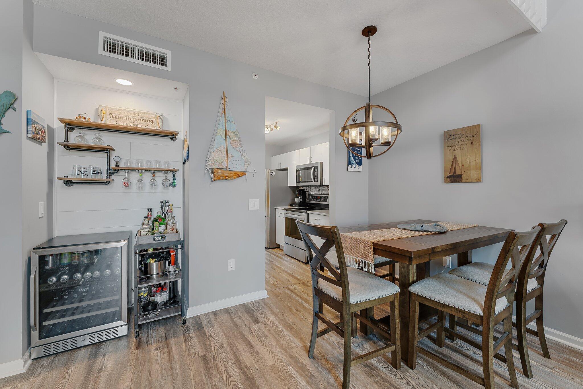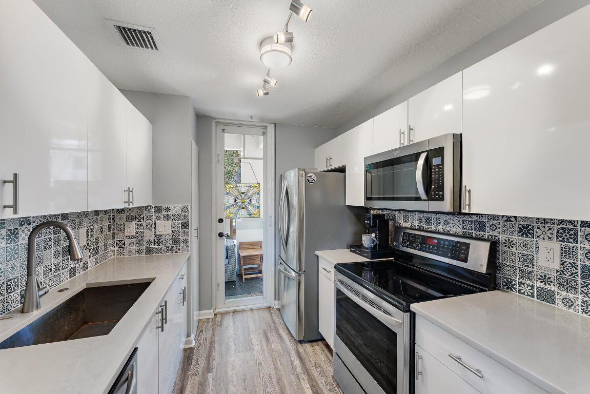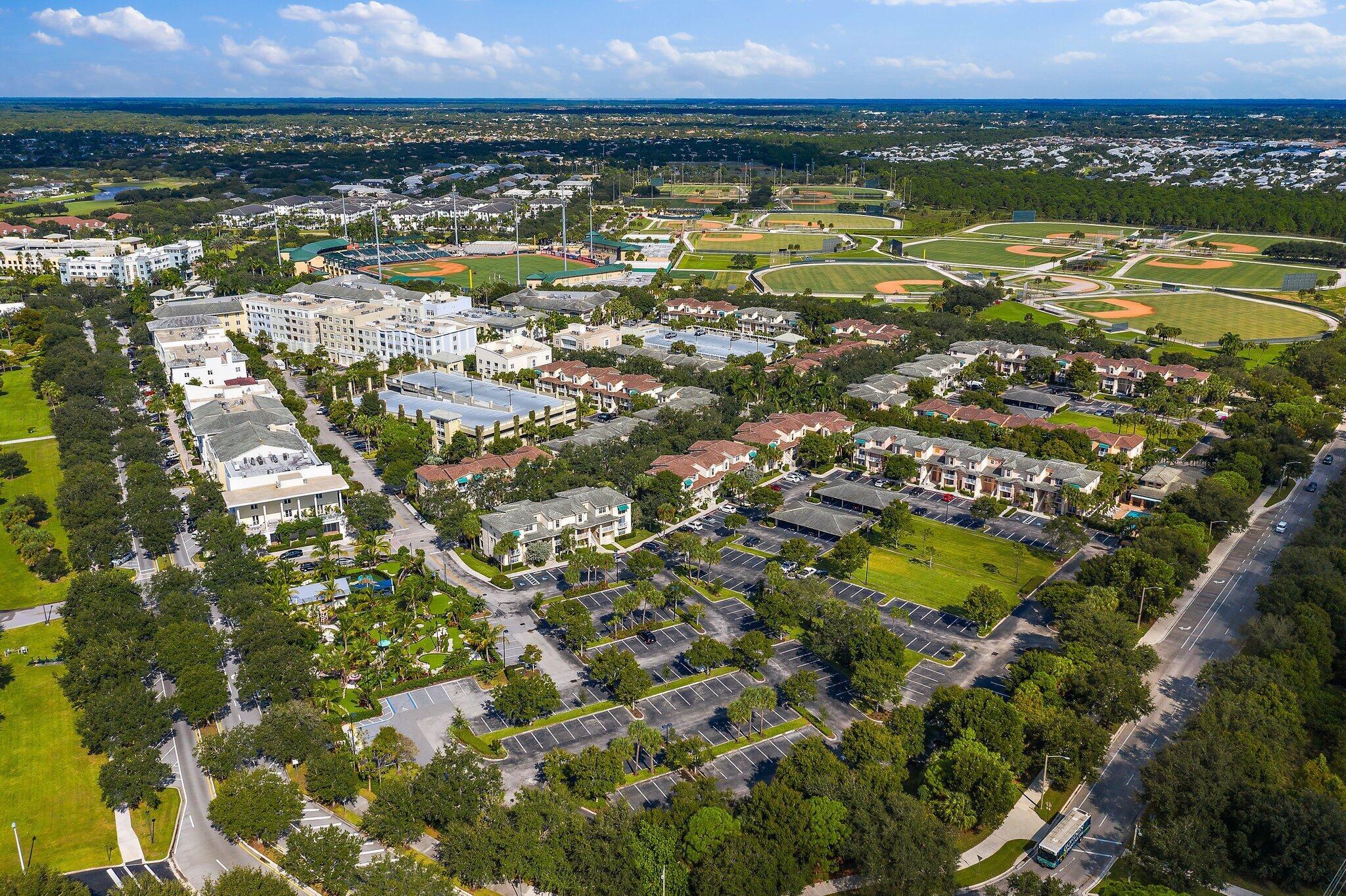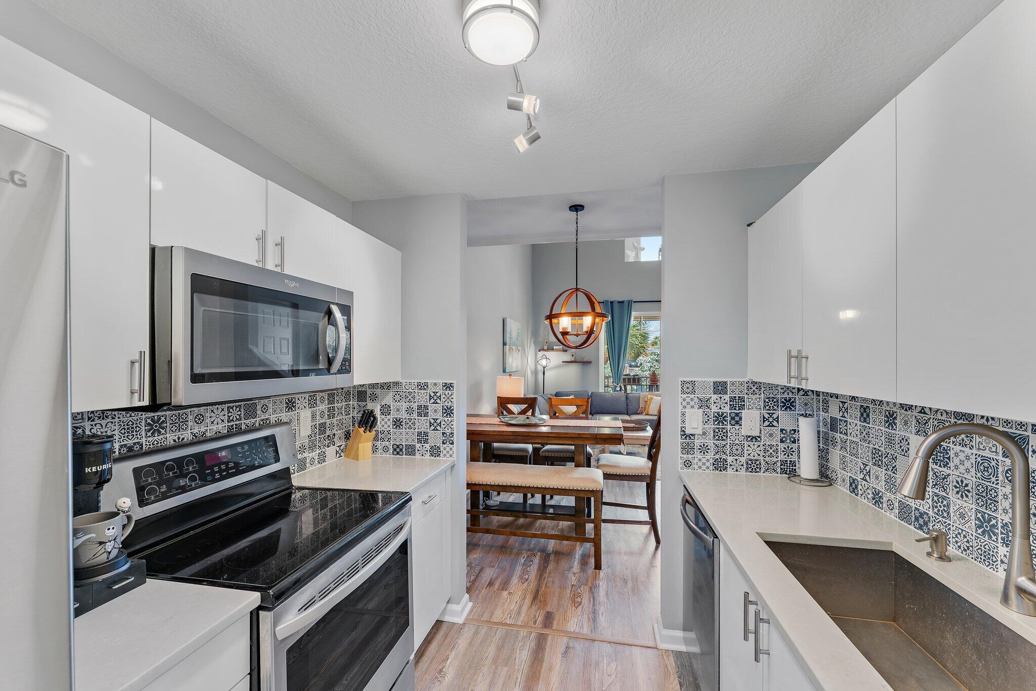 Charming 2 Bed, 2 Bath + *Carport* Condo in Prime Downtown Abacoa Location. This stunning 2-bedroom, 2-bathroom condo offers the perfect blend of modern luxury and urban convenience. The heart of this home features sleek white lacquer cabinets, quartz countertops, and a decorative backsplash that adds a touch of elegance. The open-concept living and dining areas are adorned with luxury vinyl plank flooring, providing a cohesive feel throughout the space. This lofted floor plan offers a light a bright vibe with high ceilings and a bedroom on the main floor. Enjoy peace of mind with impact glass on all windows, except for the kitchen door which has panel protection. Walking distance to downtown's Roger Dean Stadium, trendy shops, Mini Golf, and delightful eateries. HVAC 2016 HWH 2023