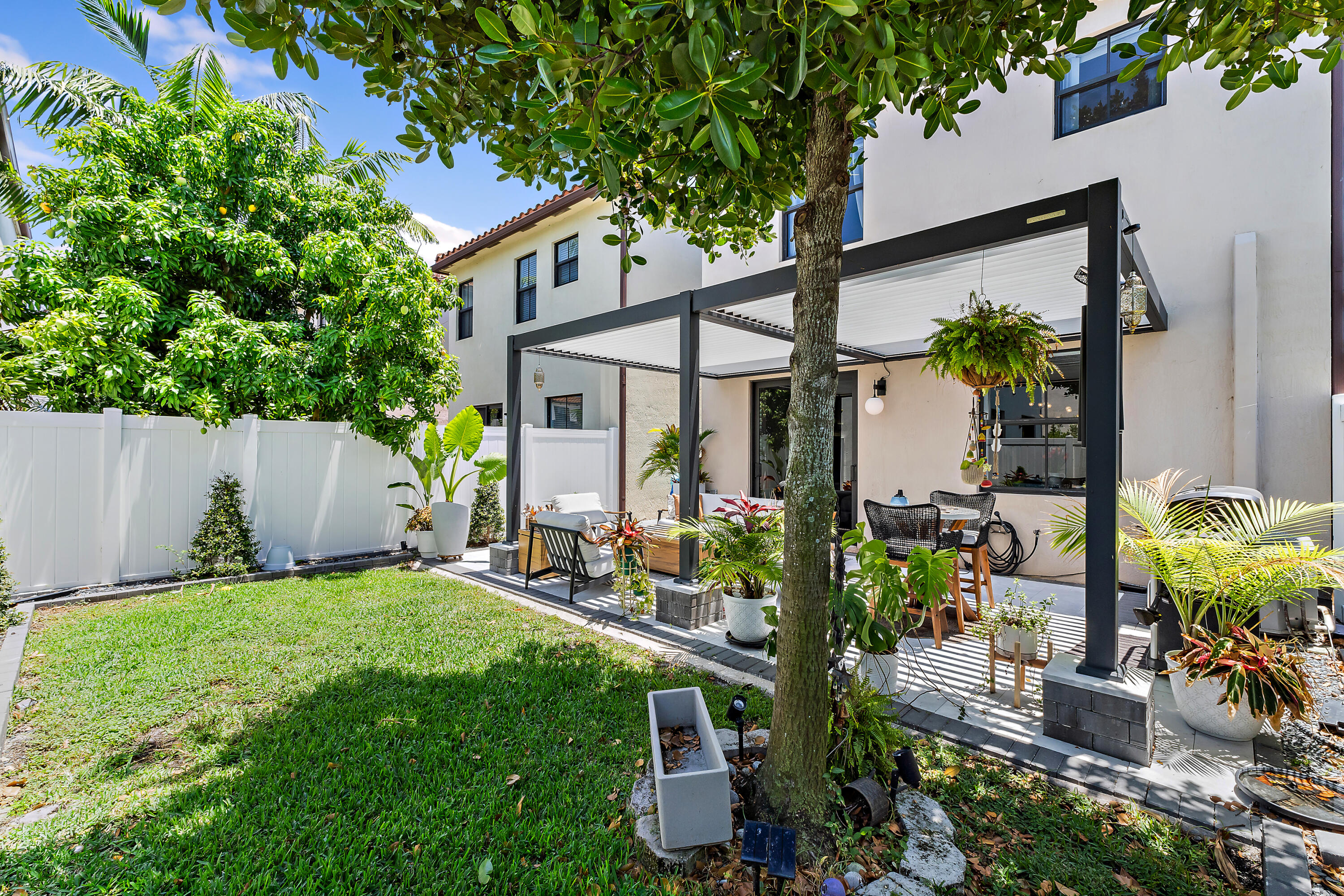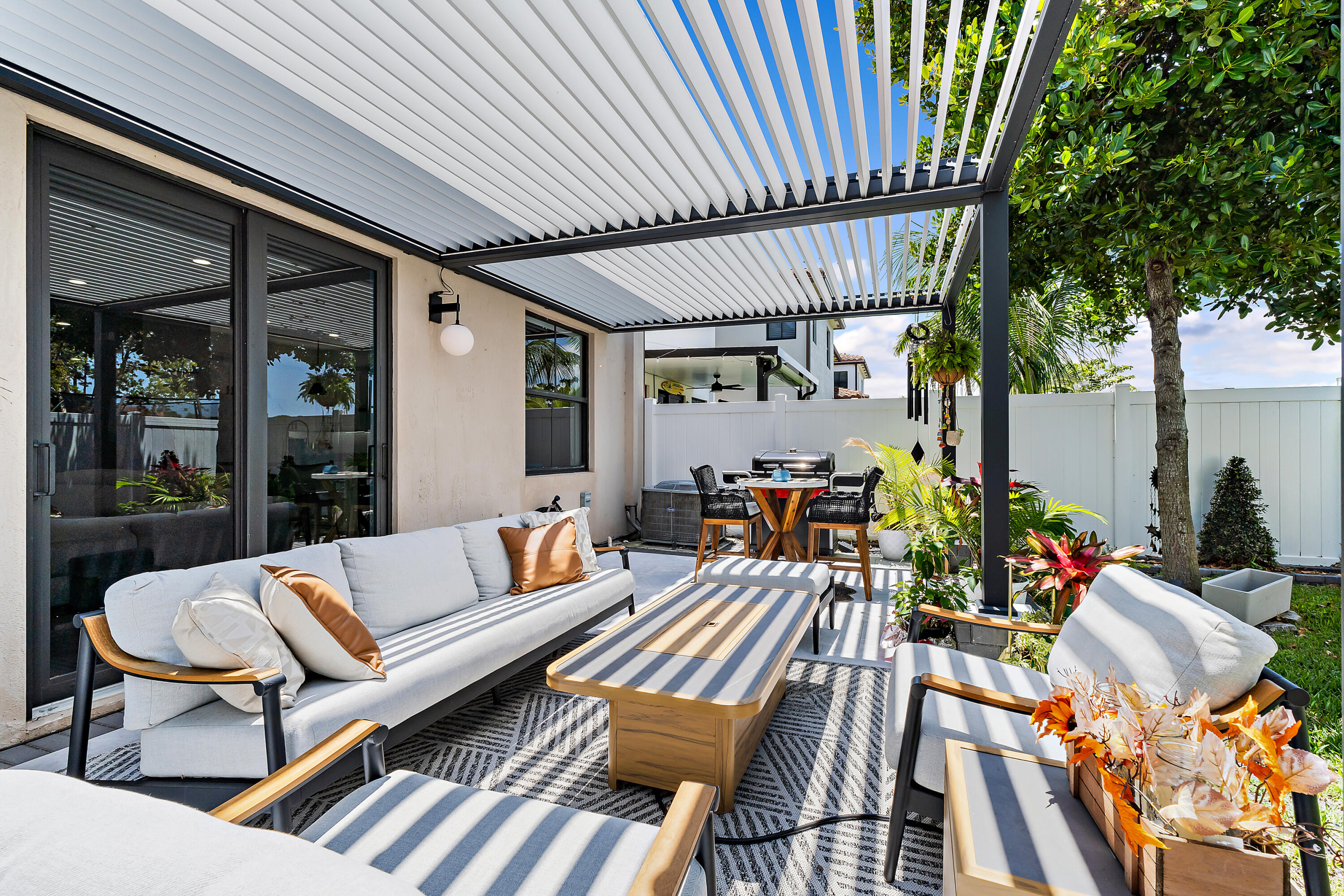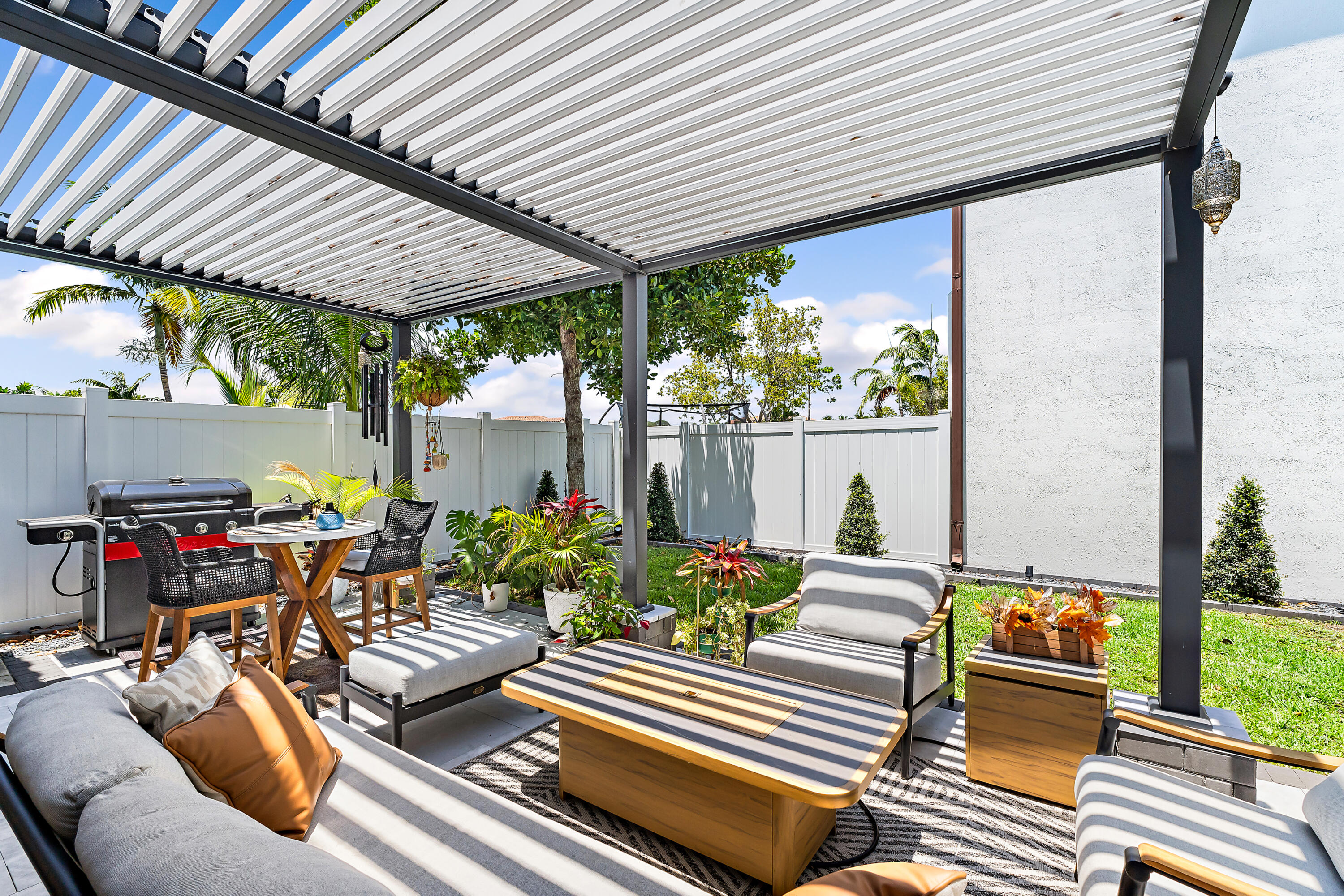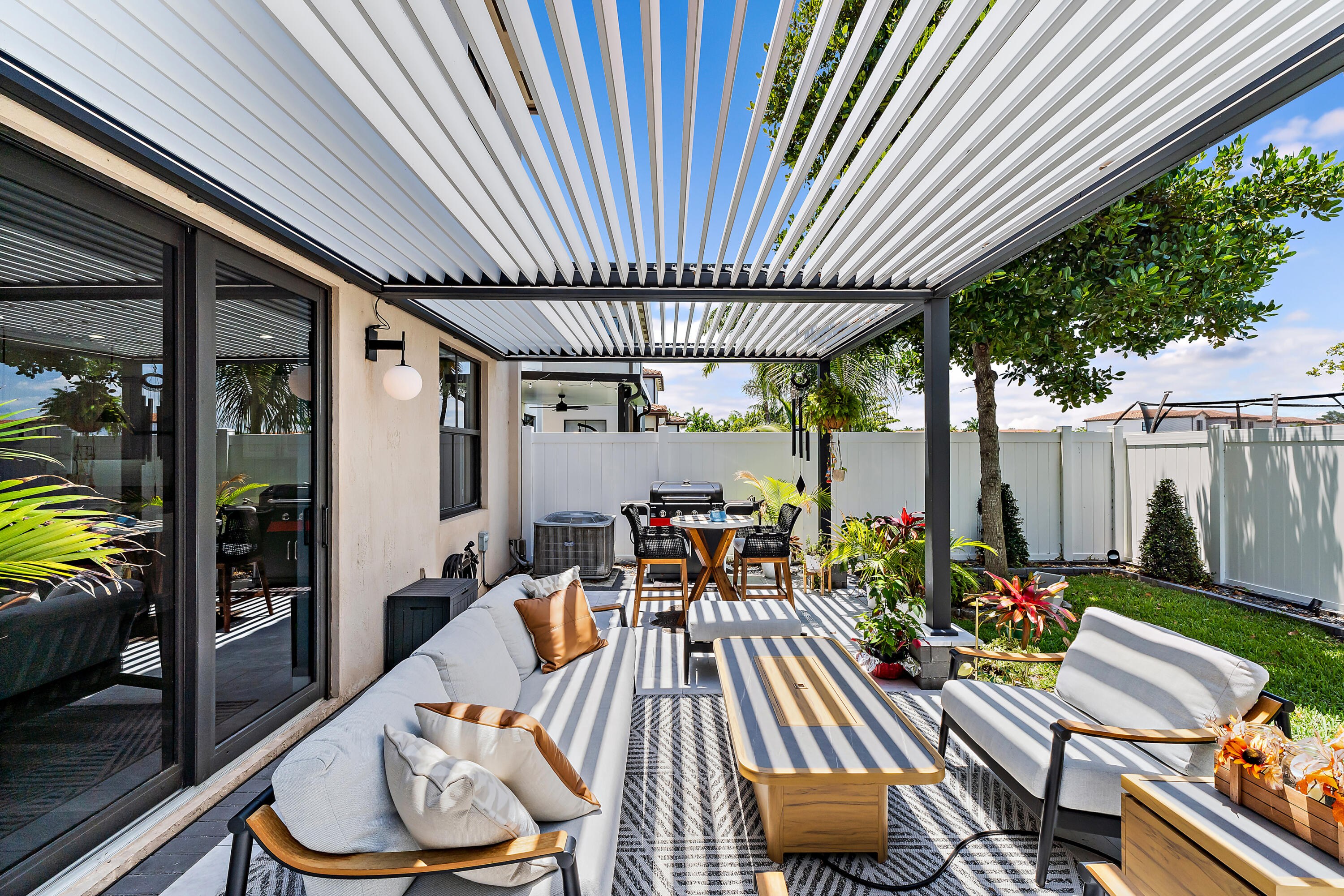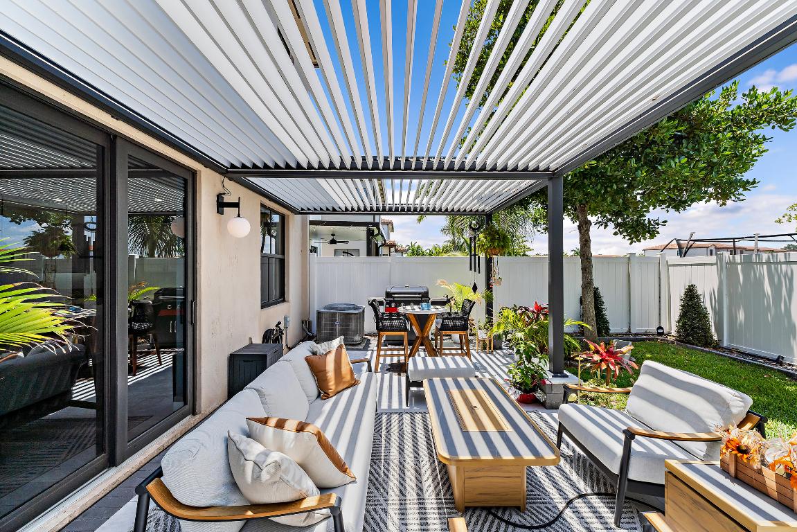 The garage is equally impressive with epoxy flooring, an EV charger, and overhead storage for added convenience. Smart home-enabled, the property features hue-changing lighting throughout, allowing you to customize the ambiance in every room. A built-in sound system in the living room and outdoor areas elevates your entertainment experience. Step outside to a beautifully upgraded backyard with travertine decking and a custom pergola. The automated louvered roof adjusts based on your lighting preferences or closes automatically in the rainperfect for seamless indoor-outdoor living. The pergola also features integrated lighting for nighttime enjoyment, making this space ideal for relaxing or entertaining year-round.